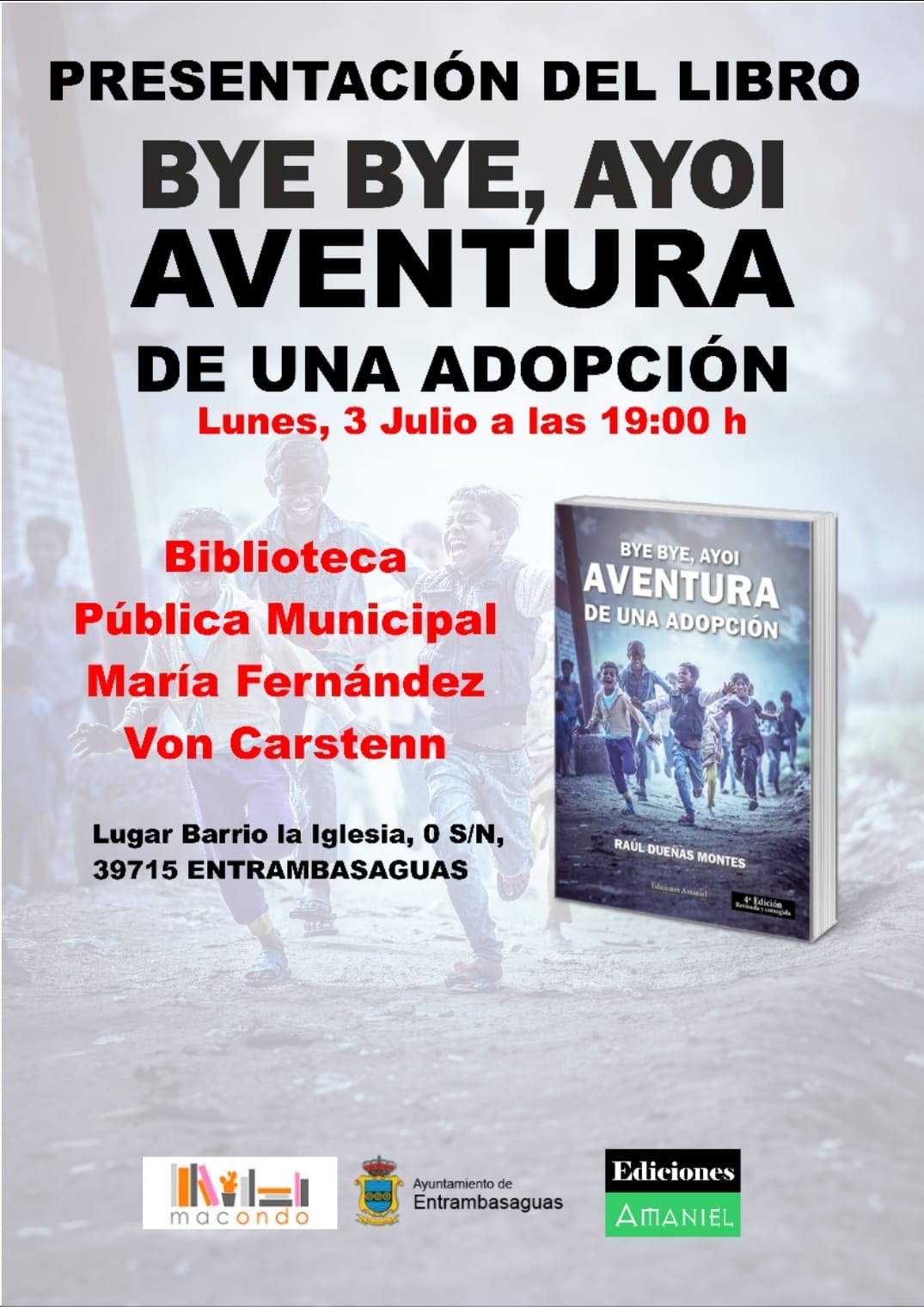 2023-07-03 19:00 h Biblioteca de Entrambasaguas Presentación del libro "BYE BYE, AYOI AVENTURA DE UNA ADOPCIÓN" Presentación del libro "BYE BYE, AYOI AVENTURA DE UNA ADOPCIÓN" de Raúl Dueñas Montes. libro.link/p/raulduemon Lunes 3 de julio a las 19:00 h en la Biblioteca de Entrambasaguas.
